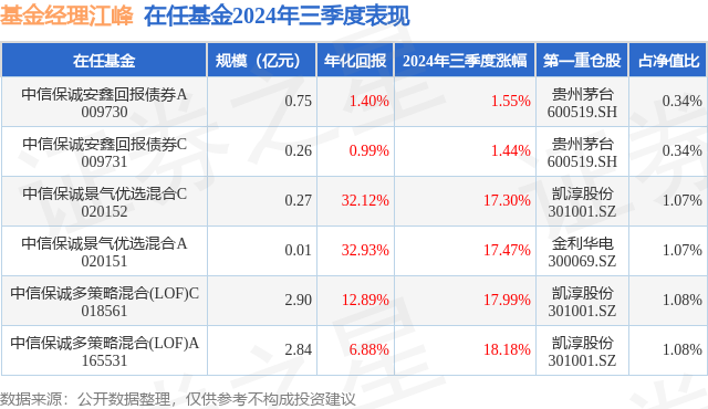 中信保诚安鑫回报债券A现任基金经理为陈岚 江峰。其中在任基金经理江峰已从业4年又196天,2024年1月23日正式接手管理中信保诚安鑫回报债券A,任职期间累计回报为6.47%。目前还管理着6只基金产品(包括A类和C类),其中本季度表现最佳的基金为中信保诚多策略混合(LOF)A(165531),季度净值涨幅为18.18%。