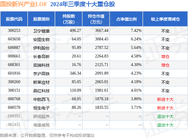 从基金规模来看,国投新兴产业LOF基金2024年三季度公布的基金规模为4.93亿元,较上一期规模4.6亿元变化了3333.47万元,环比变化了7.25%。该基金最新一期资产配置为:股票占净值比83.21%,债券占净值比9.21%,现金占净值比7.68%。从基金持仓来看,该基金当季前十大股票仓位达48.11%,第一大重仓股为卫宁健康(300253),持仓占比为7.42%。