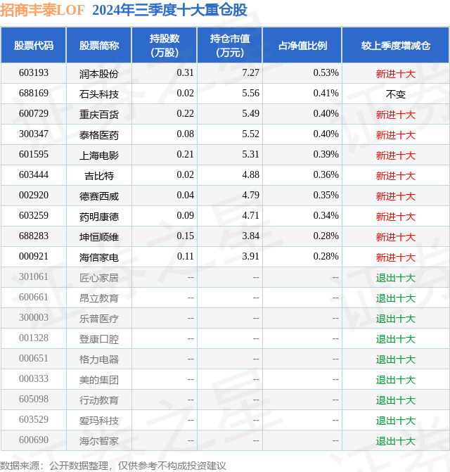 从基金规模来看,招商丰泰LOF基金2024年三季度公布的基金规模为0.14亿元,较上一期规模1393.92万元变化了-21.89万元,环比变化了-1.57%。该基金最新一期资产配置为:股票占净值比14.05%,债券占净值比6.65%,现金占净值比30.87%。从基金持仓来看,该基金当季前十大股票仓位达3.74%,第一大重仓股为润本股份(603193),持仓占比为0.53%。