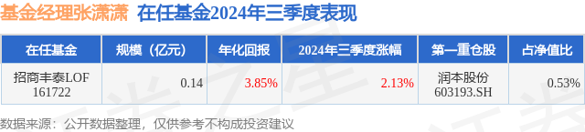 证券之星消息,日前招商丰泰LOF基金公布三季报,2024年三季度最新规模0.14亿元,季度净值涨幅为2.13%。