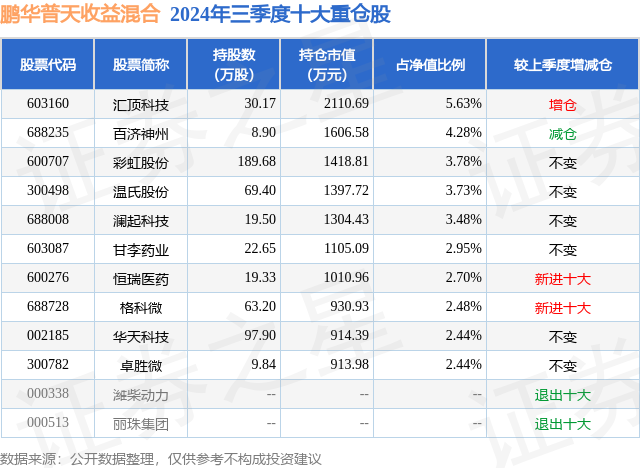 从基金规模来看,鹏华普天收益混合基金2024年三季度公布的基金规模为3.75亿元,较上一期规模3.46亿元变化了2901.71万元,环比变化了8.39%。该基金最新一期资产配置为:股票占净值比68.79%,债券占净值比21.68%,现金占净值比10.23%。从基金持仓来看,该基金当季前十大股票仓位达33.91%,第一大重仓股为汇顶科技(603160),持仓占比为5.63%。