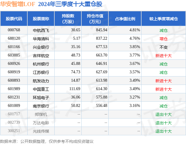 从基金规模来看,华安智增LOF基金2024年三季度公布的基金规模为1.76亿元,较上一期规模1.69亿元变化了749.06万元,环比变化了4.44%。该基金最新一期资产配置为:股票占净值比74.98%,无债券类资产,现金占净值比19.43%。从基金持仓来看,该基金当季前十大股票仓位达37.84%,第一大重仓股为中航西飞(000768),持仓占比为4.81%。
