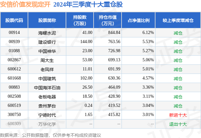 从基金规模来看,安信价值发现定开基金2024年三季度公布的基金规模为1.38亿元,较上一期规模1.42亿元变化了-439.85万元,环比变化了-3.09%。该基金最新一期资产配置为:股票占净值比91.43%,债券占净值比0.67%,现金占净值比7.47%。从基金持仓来看,该基金当季前十大股票仓位达44.08%,第一大重仓股为海螺水泥(00914),持仓占比为6.12%。