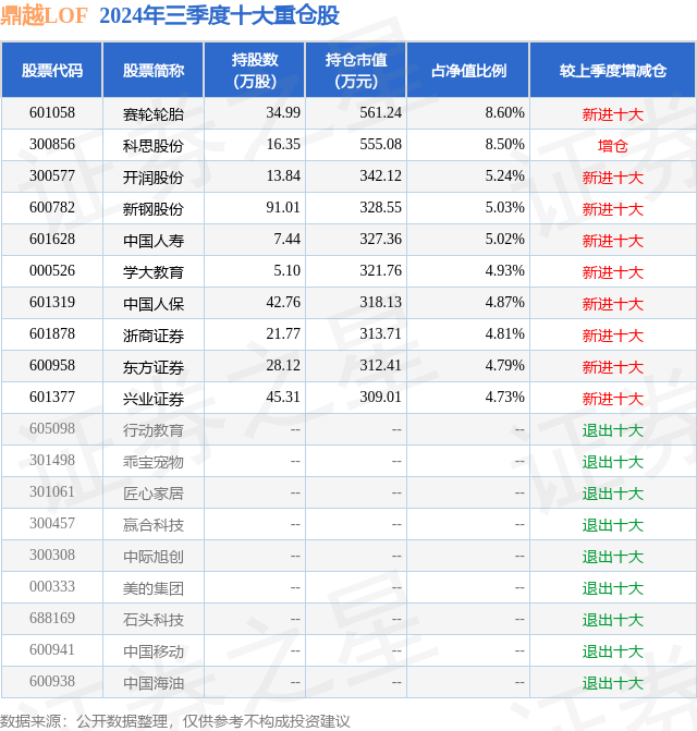 从基金规模来看,鼎越LOF基金2024年三季度公布的基金规模为0.65亿元,较上一期规模6440.51万元变化了86.89万元,环比变化了1.35%。该基金最新一期资产配置为:股票占净值比91.46%,无债券类资产,现金占净值比6.1%。从基金持仓来看,该基金当季前十大股票仓位达56.52%,第一大重仓股为赛轮轮胎(601058),持仓占比为8.6%。