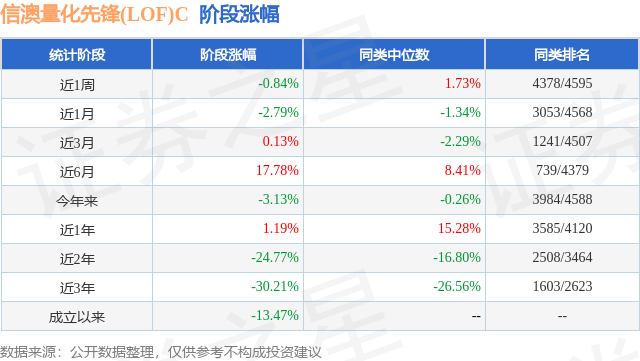从业绩表现来看,信澳量化先锋(LOF)C基金过去一年净值涨幅为-9.45%,在同类基金中排名3733/3979,同类基金过去一年净值涨幅中位数为5.4%。而基金过去一年的最大回撤为-41.28%,成立以来的最大回撤为-56.65%。
