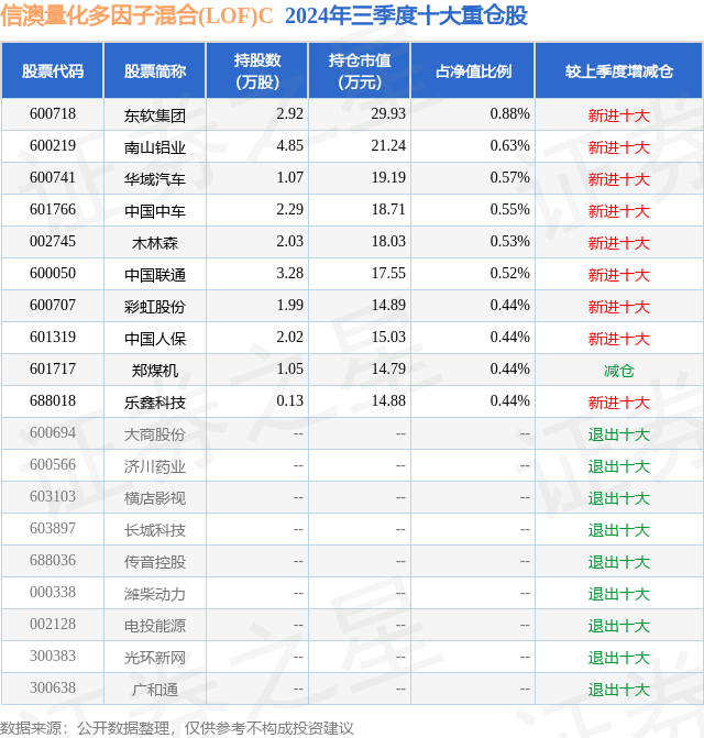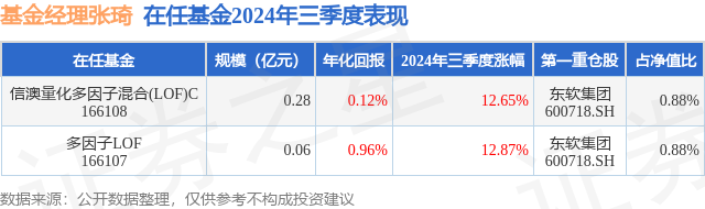 从基金规模来看,信澳量化多因子混合(LOF)C基金2024年三季度公布的基金规模为0.28亿元,较上一期规模2761.49万元变化了24.79万元,环比变化了0.9%。该基金最新一期资产配置为:股票占净值比93.37%,无债券类资产,现金占净值比6.88%。从基金持仓来看,该基金当季前十大股票仓位达5.44%,第一大重仓股为东软集团(600718),持仓占比为0.88%。