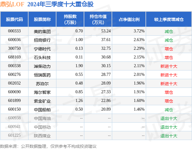 证券之星消息,日前鼎弘LOF基金公布三季报,2024年三季度最新规模0.07亿元,季度净值涨幅为1.56%。
