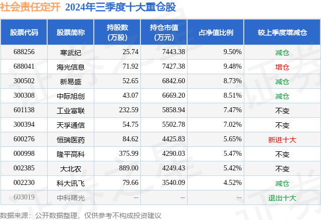 从基金规模来看,社会责任定开基金2024年三季度公布的基金规模为7.41亿元,较上一期规模6.25亿元变化了1.16亿元,环比变化了18.54%。该基金最新一期资产配置为:股票占净值比89.51%,无债券类资产,现金占净值比11.45%。从基金持仓来看,该基金当季前十大股票仓位达71.77%,第一大重仓股为寒武纪(688256),持仓占比为9.5%。