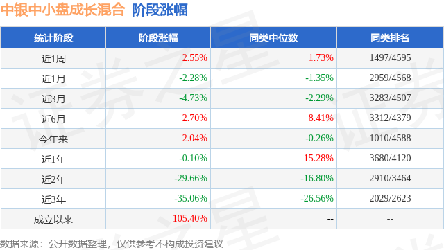 从业绩表现来看,中银中小盘成长混合基金过去一年净值涨幅为-10.77%,在同类基金中排名3791/3979,同类基金过去一年净值涨幅中位数为5.4%。而基金过去一年的最大回撤为-30.35%,成立以来的最大回撤为-62.55%。
