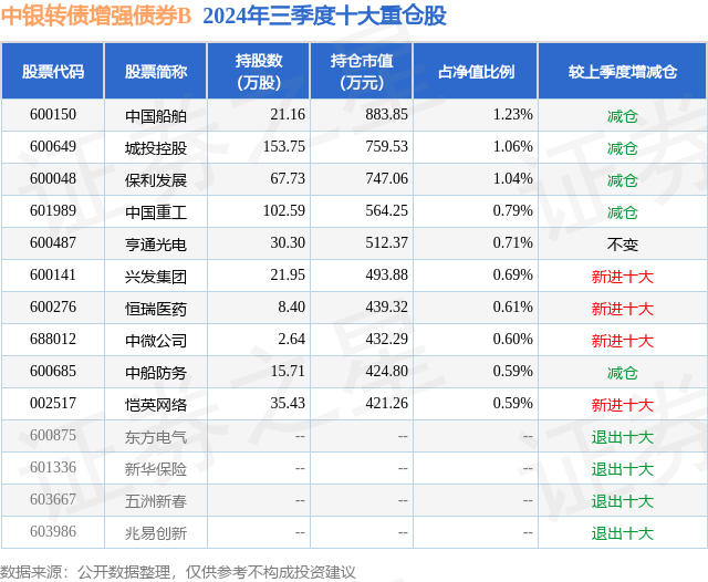 从基金规模来看,中银转债增强债券B基金2024年三季度公布的基金规模为2.3亿元,较上一期规模1.68亿元变化了6209.96万元,环比变化了37.02%。该基金最新一期资产配置为:股票占净值比19.82%,债券占净值比92.07%,现金占净值比1.85%。从基金持仓来看,该基金当季前十大股票仓位达7.91%,第一大重仓股为中国船舶(600150),持仓占比为1.23%。