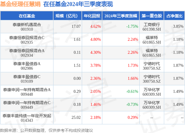 泰康丰盈债券C现任基金经理为任慧娟 陈怡。其中在任基金经理任慧娟已从业8年又324天,2023年9月5日正式接手管理泰康丰盈债券C,任职期间累计回报为2.69%。目前还管理着8只基金产品(包括A类和C类),其中本季度表现最佳的基金为泰康恒泰回报混合A(002934),季度净值涨幅为2.26%。