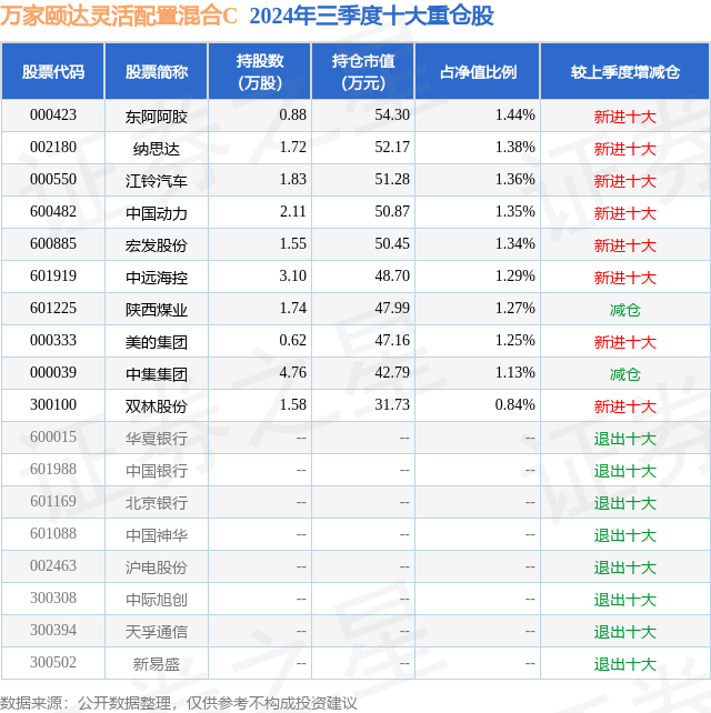 从基金规模来看,万家颐达灵活配置混合C基金2024年三季度公布的基金规模为0.01亿元,较上一期规模415.22万元变化了-327.44万元,环比变化了-78.86%。该基金最新一期资产配置为:股票占净值比92.21%,无债券类资产,现金占净值比8.84%。从基金持仓来看,该基金当季前十大股票仓位达12.65%,第一大重仓股为东阿阿胶(000423),持仓占比为1.44%。