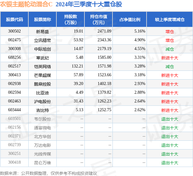 从基金规模来看,农银主题轮动混合C基金2024年三季度公布的基金规模为0.01亿元,较上一期规模703.55万元变化了-633.11万元,环比变化了-89.99%。该基金最新一期资产配置为:股票占净值比83.44%,债券占净值比2.86%,现金占净值比5.27%。从基金持仓来看,该基金当季前十大股票仓位达35.45%,第一大重仓股为新易盛(300502),持仓占比为5.16%。