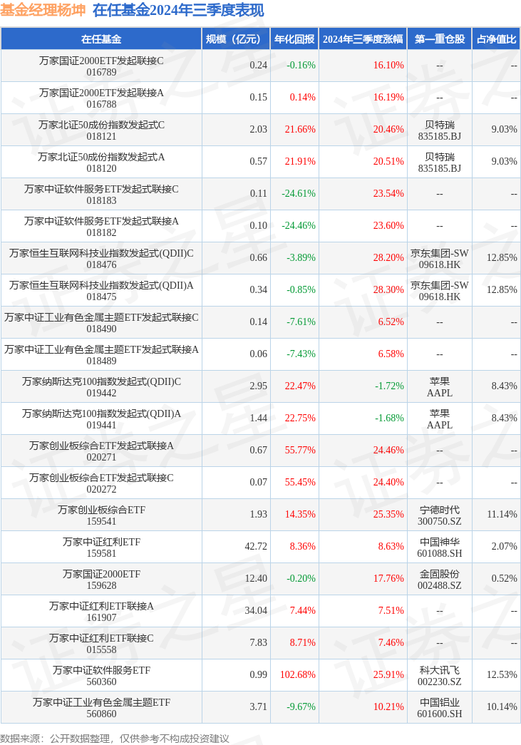 证券之星消息,日前万家纳斯达克100指数发起式(QDII)C基金公布三季报,2024年三季度最新规模2.95亿元,季度净值涨幅为-1.72%。