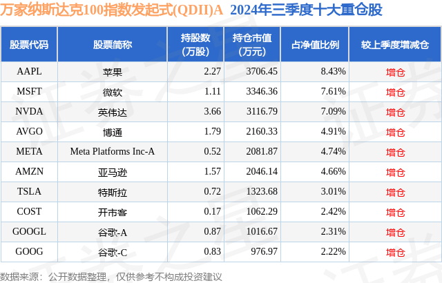证券之星消息,日前万家纳斯达克100指数发起式(QDII)A基金公布三季报,2024年三季度最新规模1.44亿元,季度净值涨幅为-1.68%。