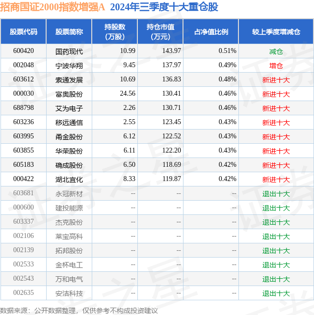 从基金规模来看,招商国证2000指数增强A基金2024年三季度公布的基金规模为0.86亿元,较上一期规模5754.24万元变化了2874.7万元,环比变化了49.96%。该基金最新一期资产配置为:股票占净值比86.3%,债券占净值比0.26%,现金占净值比6.51%。从基金持仓来看,该基金当季前十大股票仓位达4.53%,第一大重仓股为国药现代(600420),持仓占比为0.51%。