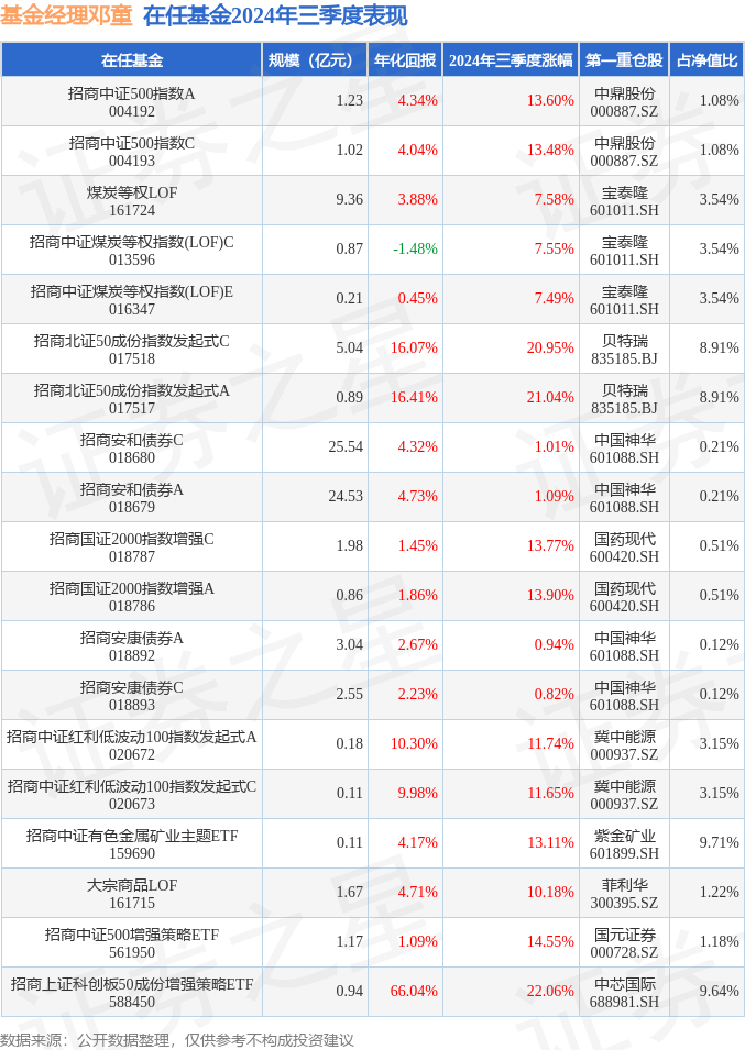 招商国证2000指数增强A现任基金经理为邓童。其中在任基金经理邓童已从业2年又338天,2023年8月1日正式接手管理招商国证2000指数增强A,任职期间累计回报为2.3%。目前还管理着19只基金产品(包括A类和C类),其中本季度表现最佳的基金为招商上证科创板50成份增强策略ETF(588450),季度净值涨幅为22.06%。
