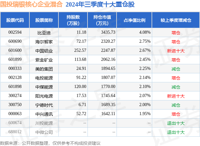 从基金规模来看,国投瑞银核心企业混合基金2024年三季度公布的基金规模为8.43亿元,较上一期规模8.3亿元变化了1252.98万元,环比变化了1.51%。该基金最新一期资产配置为:股票占净值比89.24%,债券占净值比1.26%,现金占净值比12.31%。从基金持仓来看,该基金当季前十大股票仓位达24.46%,第一大重仓股为比亚迪(002594),持仓占比为4.08%。
