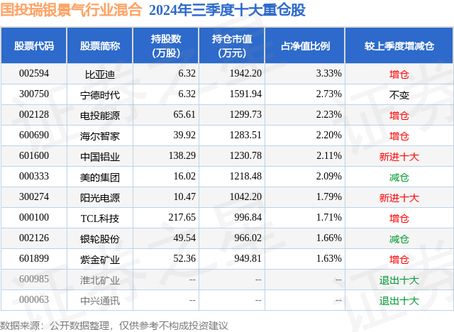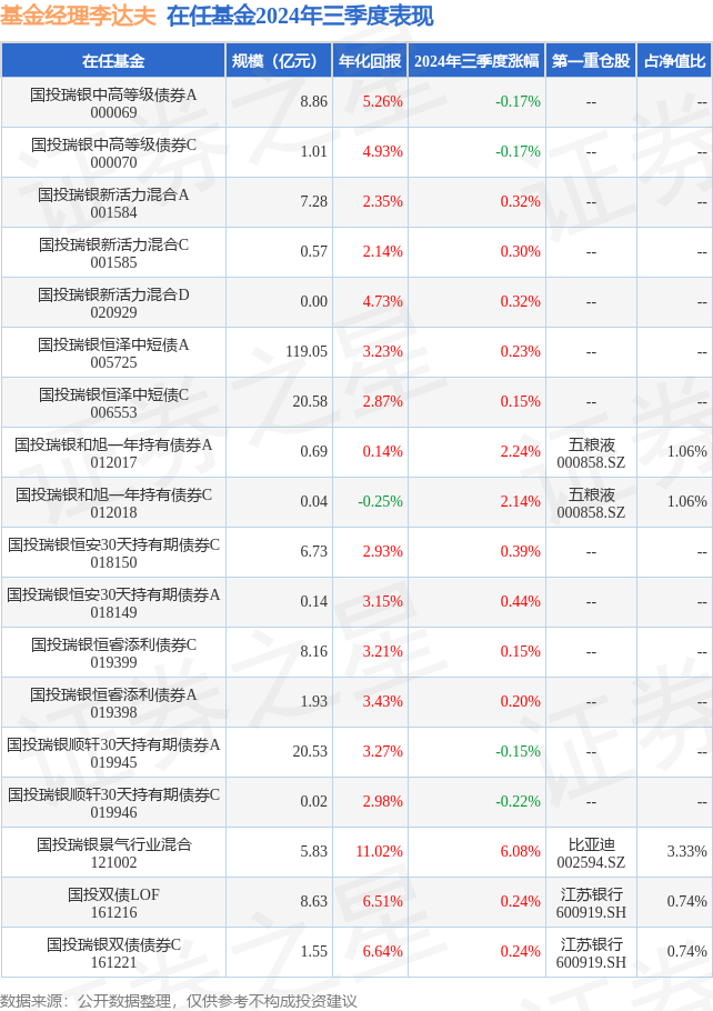 从基金规模来看,国投瑞银景气行业混合基金2024年三季度公布的基金规模为5.83亿元,较上一期规模5.56亿元变化了2682.12万元,环比变化了4.82%。该基金最新一期资产配置为:股票占净值比72.68%,债券占净值比36.45%,现金占净值比3.7%。从基金持仓来看,该基金当季前十大股票仓位达21.48%,第一大重仓股为比亚迪(002594),持仓占比为3.33%。