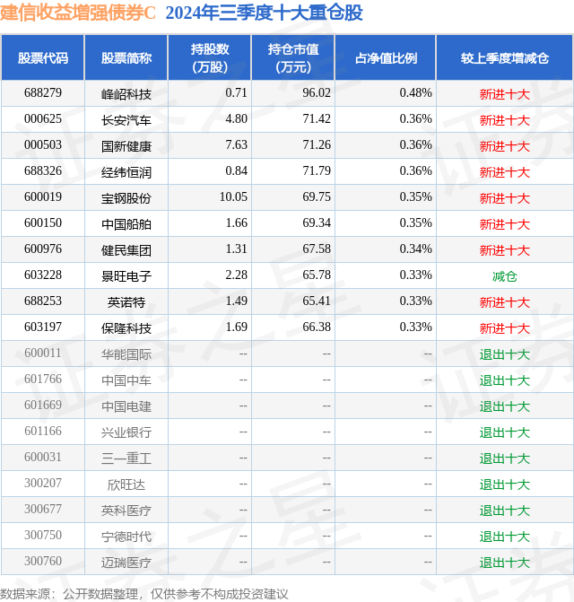 从基金规模来看,建信收益增强债券C基金2024年三季度公布的基金规模为0.41亿元,较上一期规模3997.37万元变化了79.41万元,环比变化了1.99%。该基金最新一期资产配置为:股票占净值比16.2%,债券占净值比81.05%,现金占净值比3.13%。从基金持仓来看,该基金当季前十大股票仓位达3.59%,第一大重仓股为峰岹科技(688279),持仓占比为0.48%。
