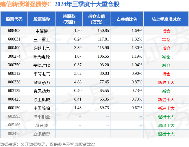 从基金规模来看,建信转债增强债券C基金2024年三季度公布的基金规模为0.48亿元,较上一期规模4655.95万元变化了106.93万元,环比变化了2.3%。该基金最新一期资产配置为:股票占净值比19.98%,债券占净值比87.31%,现金占净值比2.28%。从基金持仓来看,该基金当季前十大股票仓位达10.44%,第一大重仓股为中信博(688408),持仓占比为1.69%。