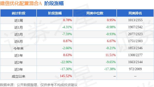 从业绩表现来看,建信优化配置混合A基金过去一年净值涨幅为5.49%,在同类基金中排名1151/2261,同类基金过去一年净值涨幅中位数为5.1%。而基金过去一年的最大回撤为-19.59%,成立以来的最大回撤为-61.66%。