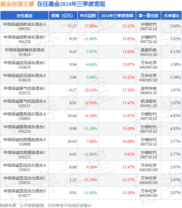 从基金规模来看,中信保诚优胜精选混合A基金2024年三季度公布的基金规模为20.03亿元,较上一期规模19.01亿元变化了1.02亿元,环比变化了5.36%。该基金最新一期资产配置为:股票占净值比76.93%,无债券类资产,现金占净值比23.5%。从基金持仓来看,该基金当季前十大股票仓位达29.98%,第一大重仓股为宁德时代(300750),持仓占比为3.77%。