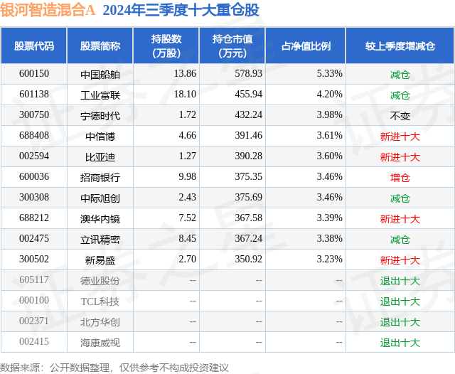 从基金规模来看,银河智造混合A基金2024年三季度公布的基金规模为1.03亿元,较上一期规模8960.72万元变化了1302.42万元,环比变化了14.53%。该基金最新一期资产配置为:股票占净值比94.73%,无债券类资产,现金占净值比5.36%。从基金持仓来看,该基金当季前十大股票仓位达37.64%,第一大重仓股为中国船舶(600150),持仓占比为5.33%。