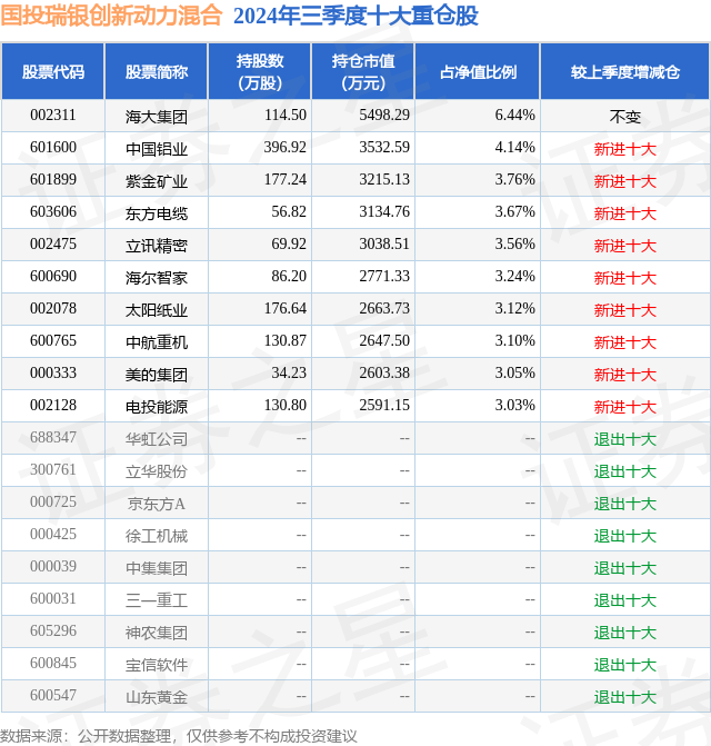 从基金规模来看,国投瑞银创新动力混合基金2024年三季度公布的基金规模为8.54亿元,较上一期规模8.13亿元变化了4111.71万元,环比变化了5.06%。该基金最新一期资产配置为:股票占净值比86.76%,债券占净值比4.34%,现金占净值比2.92%。从基金持仓来看,该基金当季前十大股票仓位达37.11%,第一大重仓股为海大集团(002311),持仓占比为6.44%。