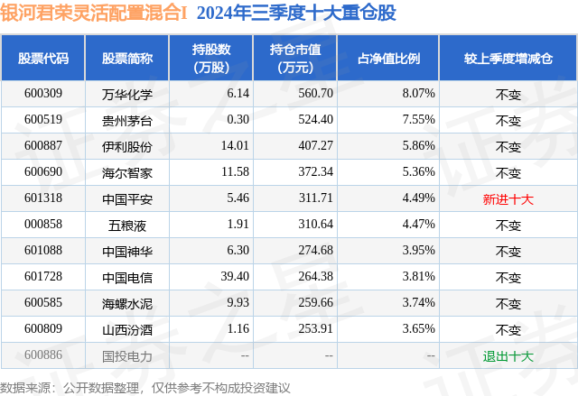 从基金规模来看,银河君荣灵活配置混合I基金2024年三季度公布的基金规模为0.66亿元,较上一期规模5816.49万元变化了774.54万元,环比变化了13.32%。该基金最新一期资产配置为:股票占净值比86.05%,债券占净值比5.65%,现金占净值比1.48%。从基金持仓来看,该基金当季前十大股票仓位达50.95%,第一大重仓股为万华化学(600309),持仓占比为8.07%。