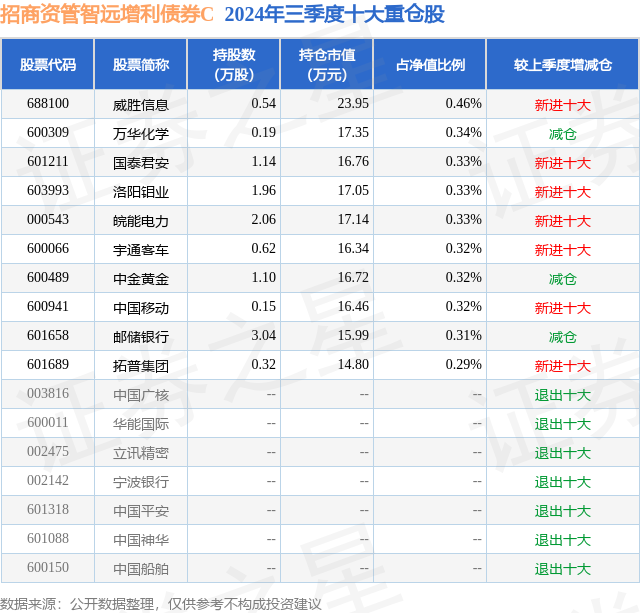 从基金规模来看,招商资管智远增利债券C基金2024年三季度公布的基金规模为0.01亿元,较上一期规模328.21万元变化了-180.02万元,环比变化了-54.85%。该基金最新一期资产配置为:股票占净值比3.67%,债券占净值比55.43%,现金占净值比6.18%。从基金持仓来看,该基金当季前十大股票仓位达3.35%,第一大重仓股为威胜信息(688100),持仓占比为0.46%。
