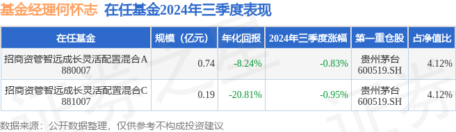 从基金规模来看,招商资管智远成长灵活配置混合C基金2024年三季度公布的基金规模为0.19亿元,较上一期规模2028.32万元变化了-87.04万元,环比变化了-4.29%。该基金最新一期资产配置为:股票占净值比62.85%,无债券类资产,现金占净值比9.22%。从基金持仓来看,该基金当季前十大股票仓位达27.89%,第一大重仓股为贵州茅台(600519),持仓占比为4.12%。