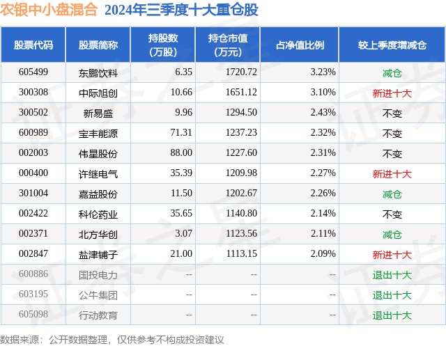 从基金规模来看,农银中小盘混合基金2024年三季度公布的基金规模为5.32亿元,较上一期规模5.2亿元变化了1255.25万元,环比变化了2.42%。该基金最新一期资产配置为:股票占净值比73.87%,无债券类资产,现金占净值比24.65%。从基金持仓来看,该基金当季前十大股票仓位达24.26%,第一大重仓股为东鹏饮料(605499),持仓占比为3.23%。