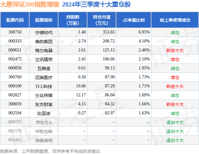 从基金规模来看,大摩深证300指数增强基金2024年三季度公布的基金规模为0.51亿元,较上一期规模4424.42万元变化了666.35万元,环比变化了15.06%。该基金最新一期资产配置为:股票占净值比94.56%,无债券类资产,现金占净值比5.57%。从基金持仓来看,该基金当季前十大股票仓位达25.98%,第一大重仓股为宁德时代(300750),持仓占比为6.95%。