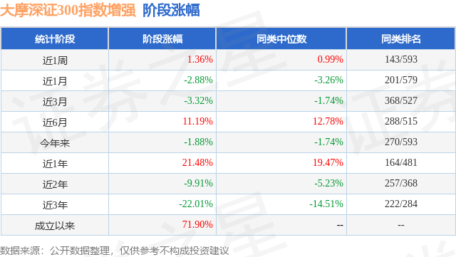 从业绩表现来看,大摩深证300指数增强基金过去一年净值涨幅为13.98%,在同类基金中排名138/457,同类基金过去一年净值涨幅中位数为10.83%。而基金过去一年的最大回撤为-15.39%,成立以来的最大回撤为-56.73%。
