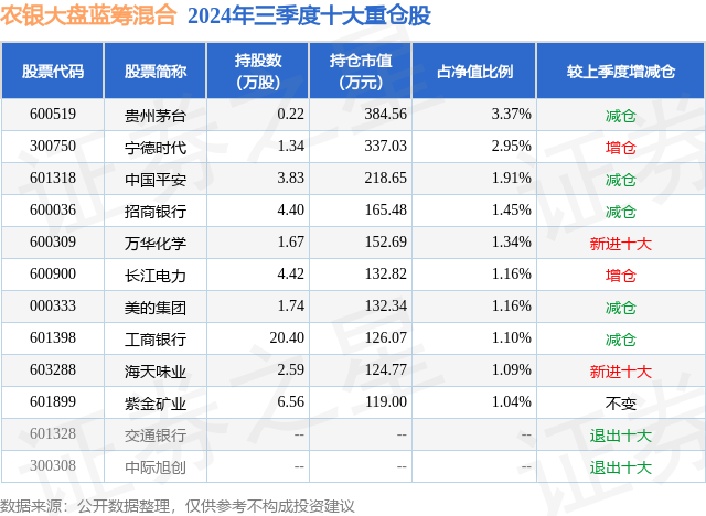从基金规模来看,农银大盘蓝筹混合基金2024年三季度公布的基金规模为1.14亿元,较上一期规模1.06亿元变化了856.03万元,环比变化了8.1%。该基金最新一期资产配置为:股票占净值比76.57%,债券占净值比1.32%,现金占净值比21.49%。从基金持仓来看,该基金当季前十大股票仓位达16.57%,第一大重仓股为贵州茅台(600519),持仓占比为3.37%。