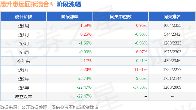 从业绩表现来看,惠升惠远回报混合A基金过去一年净值涨幅为-7.24%,在同类基金中排名2074/2261,同类基金过去一年净值涨幅中位数为5.1%。而基金过去一年的最大回撤为-19.6%,成立以来的最大回撤为-33.32%。