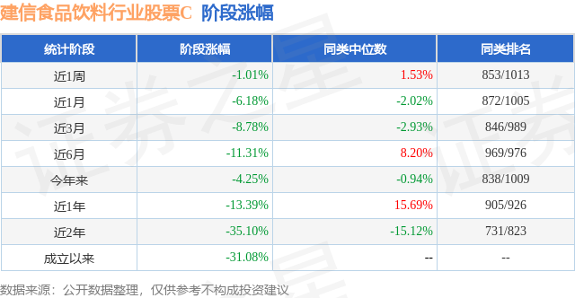 从业绩表现来看,建信食品饮料行业股票C基金过去一年净值涨幅为-17.95%,在同类基金中排名885/897,同类基金过去一年净值涨幅中位数为6.57%。而基金过去一年的最大回撤为-36.31%,成立以来的最大回撤为-43.73%。