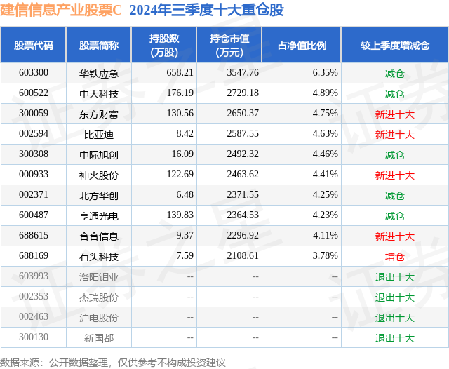 从基金规模来看,建信信息产业股票C基金2024年三季度公布的基金规模为0.03亿元,较上一期规模243.21万元变化了45.33万元,环比变化了18.64%。该基金最新一期资产配置为:股票占净值比92.01%,无债券类资产,现金占净值比8.2%。从基金持仓来看,该基金当季前十大股票仓位达45.86%,第一大重仓股为华铁应急(603300),持仓占比为6.35%。