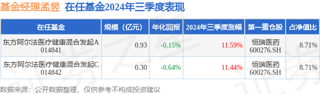 证券之星消息,日前东方阿尔法医疗健康混合发起C基金公布三季报,2024年三季度最新规模0.3亿元,季度净值涨幅为11.44%。