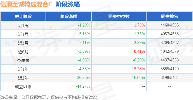 从业绩表现来看,信澳至诚精选混合C基金过去一年净值涨幅为-7.02%,在同类基金中排名3590/3979,同类基金过去一年净值涨幅中位数为5.4%。而基金过去一年的最大回撤为-22.86%,成立以来的最大回撤为-49.24%。