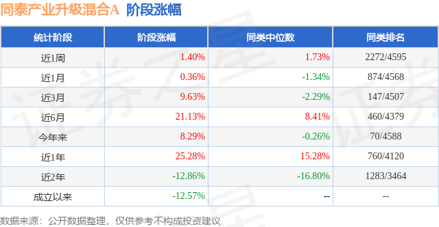 从业绩表现来看,同泰产业升级混合A基金过去一年净值涨幅为7.43%,在同类基金中排名1831/3979,同类基金过去一年净值涨幅中位数为5.4%。而基金过去一年的最大回撤为-20.98%,成立以来的最大回撤为-39.82%。