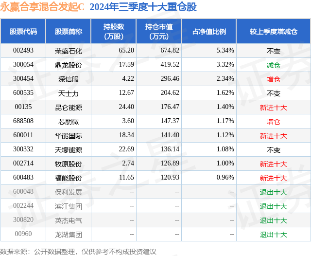 从基金规模来看,永赢合享混合发起C基金2024年三季度公布的基金规模为0.26亿元,较上一期规模2533.03万元变化了65.19万元,环比变化了2.57%。该基金最新一期资产配置为:股票占净值比25.22%,债券占净值比78.24%,现金占净值比5.11%。从基金持仓来看,该基金当季前十大股票仓位达19.35%,第一大重仓股为荣盛石化(002493),持仓占比为5.34%。