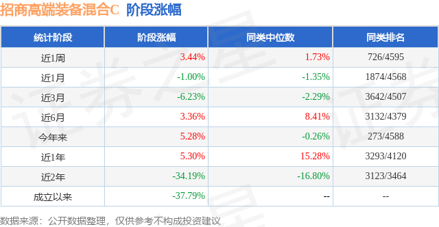 从业绩表现来看,招商高端装备混合C基金过去一年净值涨幅为-4.88%,在同类基金中排名3367/3979,同类基金过去一年净值涨幅中位数为5.4%。而基金过去一年的最大回撤为-32.02%,成立以来的最大回撤为-53.65%。