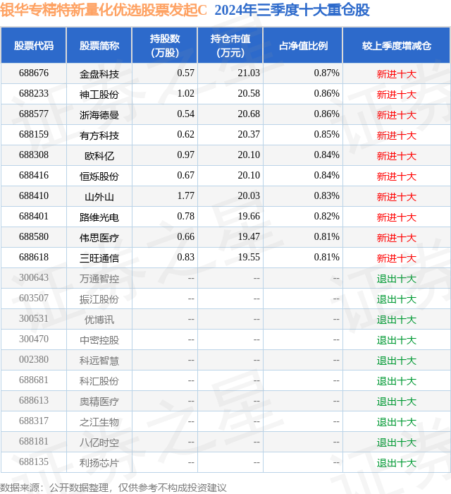 从基金规模来看,银华专精特新量化优选股票发起C基金2024年三季度公布的基金规模为0.06亿元,较上一期规模516.3万元变化了44.99万元,环比变化了8.71%。该基金最新一期资产配置为:股票占净值比93.97%,债券占净值比3.35%,现金占净值比5.32%。从基金持仓来看,该基金当季前十大股票仓位达8.39%,第一大重仓股为金盘科技(688676),持仓占比为0.87%。