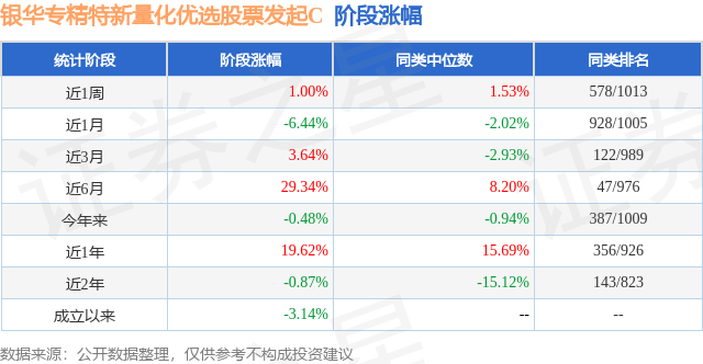从业绩表现来看,银华专精特新量化优选股票发起C基金过去一年净值涨幅为5.84%,在同类基金中排名491/897,同类基金过去一年净值涨幅中位数为6.57%。而基金过去一年的最大回撤为-36.39%,成立以来的最大回撤为-39.88%。