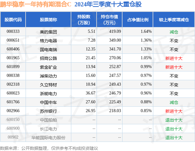 从基金规模来看,鹏华稳享一年持有期混合C基金2024年三季度公布的基金规模为1.33亿元,较上一期规模1.5亿元变化了-1654.04万元,环比变化了-11.03%。该基金最新一期资产配置为:股票占净值比16.17%,债券占净值比70.13%,现金占净值比13.88%。从基金持仓来看,该基金当季前十大股票仓位达11.0%,第一大重仓股为美的集团(000333),持仓占比为1.64%。