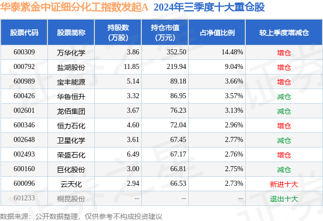 证券之星消息,日前华泰紫金中证细分化工指数发起A基金公布三季报,2024年三季度最新规模0.15亿元,季度净值涨幅为9.21%。