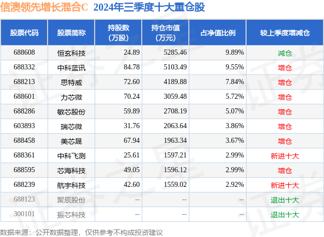 从基金规模来看,信澳领先增长混合C基金2024年三季度公布的基金规模为0.1亿元,较上一期规模1037.82万元变化了-70.1万元,环比变化了-6.75%。该基金最新一期资产配置为:股票占净值比94.17%,债券占净值比0.24%,现金占净值比5.05%。从基金持仓来看,该基金当季前十大股票仓位达54.5%,第一大重仓股为恒玄科技(688608),持仓占比为9.89%。