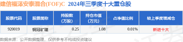 从基金规模来看,建信福泽安泰混合(FOF)C基金2024年三季度公布的基金规模为0.0亿元,较上一期规模0.09万元变化了-0.0万元,环比变化了-0.54%。该基金最新一期资产配置为:股票占净值比0.01%,债券占净值比5.39%,现金占净值比2.11%。从基金持仓来看,该基金当季前十大股票仓位达0.01%,第一大重仓股为铜冠矿建(920019),持仓占比为0.01%。